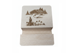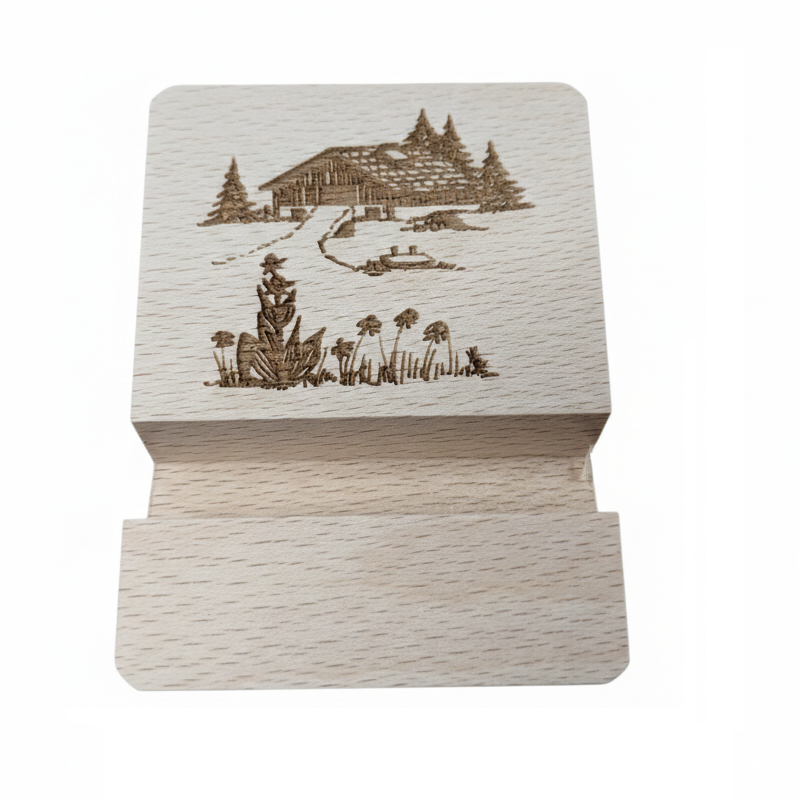 Support de téléphone en chêne massif avec une gravure de ferme comtoise réalisée au laser.